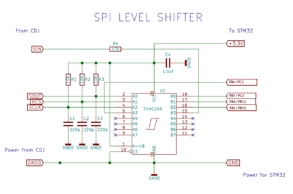 A SPI level shifter is used to convert the voltage of the logic level a device is working on. The CDJ 1000 works with 5volts the STM32 works wit 3.3volt.