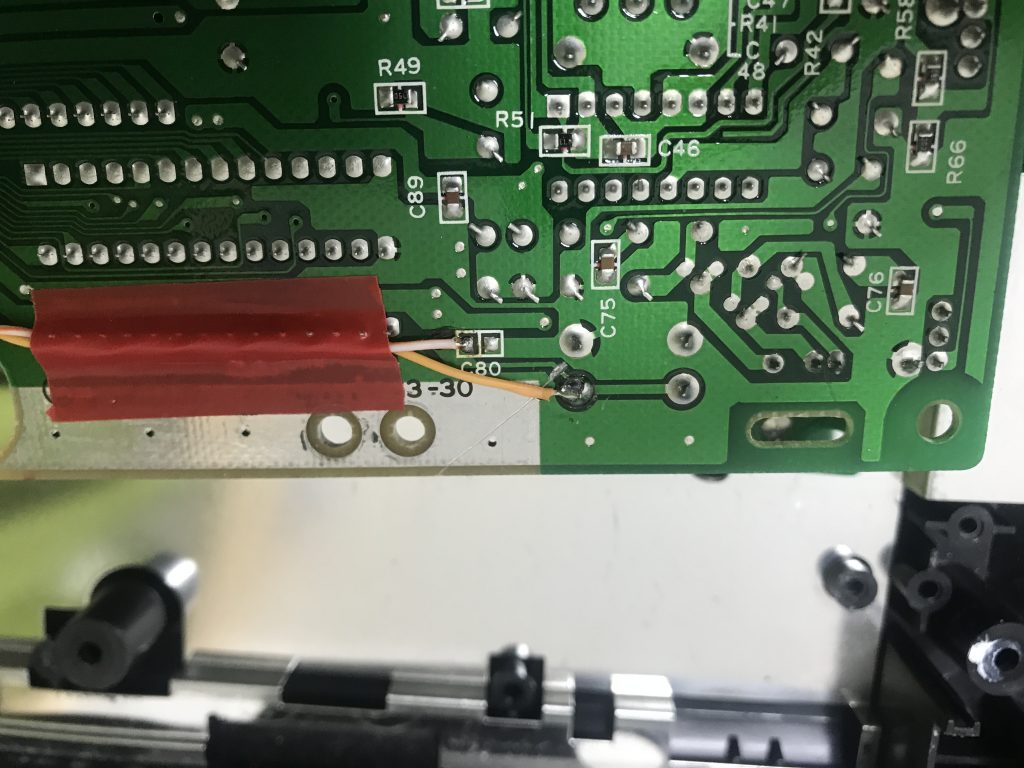 This is the underside of the main PCB. This is where you have to cut the path and solder 2 wires so we can control the RESET button with the Arduino. ( You really should not use this electrical tape! )